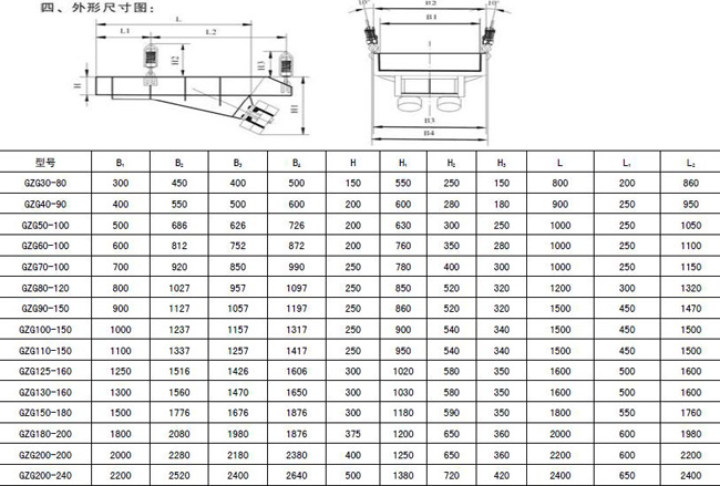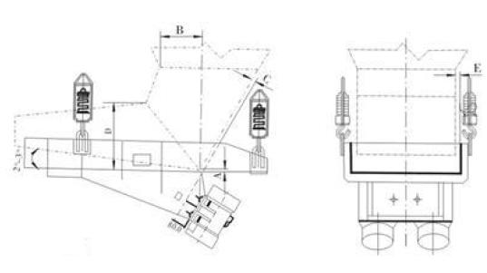 電機振動給料機設(shè)計時未考慮倉壓的影響,為保證給料機的正常運行,必須盡量減少倉壓對給料機的影響。因此在設(shè)計溜嘴時,應(yīng)用溜嘴的后側(cè)板承擔(dān)料柱的垂直壓力。溜嘴形式及配置尺寸可參考圖及表中數(shù)值。