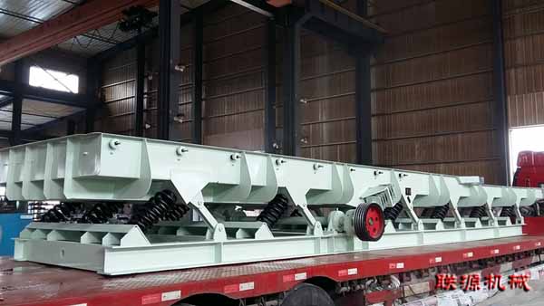 輸送槽與底架之間用螺旋彈簧聯(lián)接,該彈簧是主振彈簧,導向桿起輸送槽振動導向作用,輸送機運行中驅(qū)動機構(gòu)使連桿端部作往復運動,而連桿通過其端部的螺旋彈簧帶動輸送槽作往復運動,使物料沿振動方向被連續(xù)拋起向前跳躍,達到輸送物料的目的。