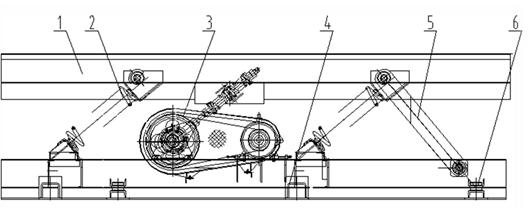 1輸送槽、2主振彈簧、3驅(qū)動連桿機構(gòu)、4底座、5導向桿、6輔助支座。